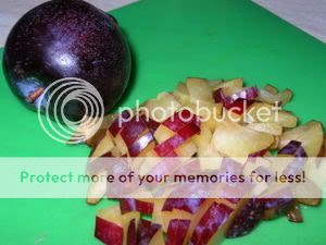 2. Put in the chopped plums and stir, then add the cinnamon powder, balsamic vinegar, lime juice and salt. Stir well.